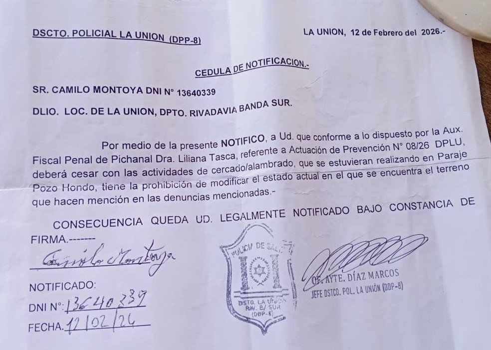 Sin embargo, el cacique de la comunidad recibió una Cédula de Notificación de la doctora Liliana Tasca, auxiliar de la Fiscalía Penal de Pichanal donde solicita que «cese las actividades del alambrado/cercado».