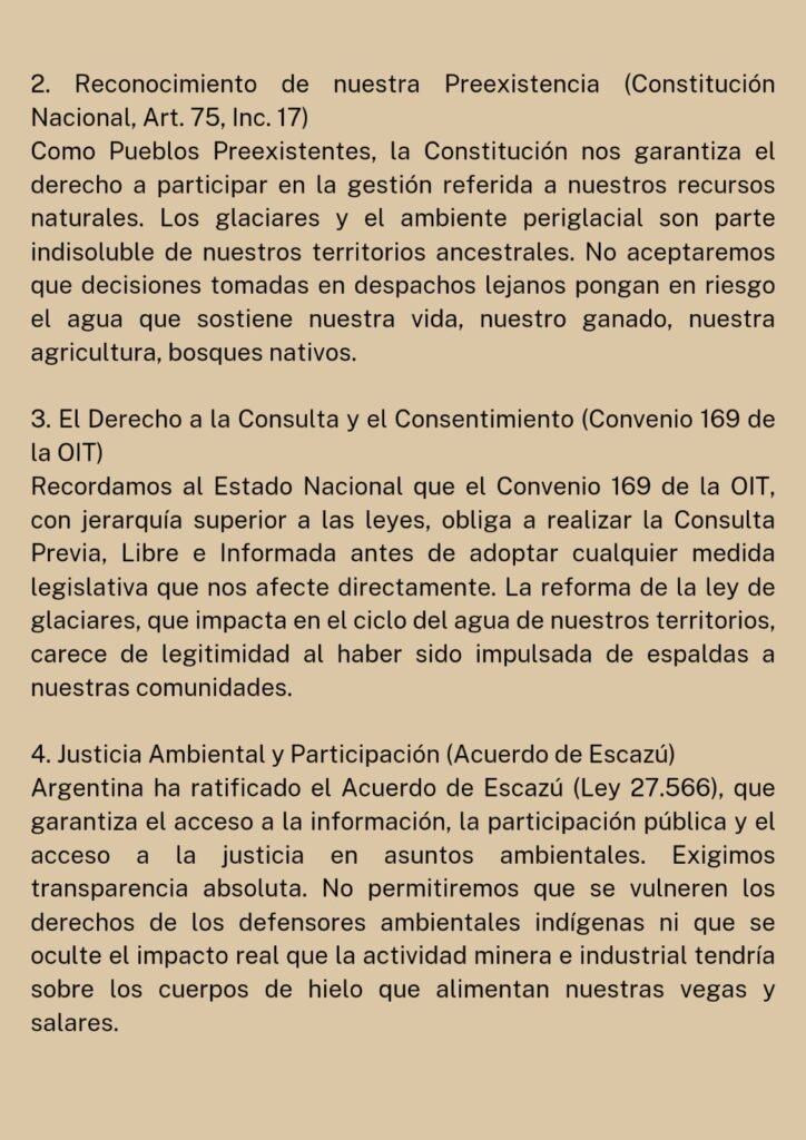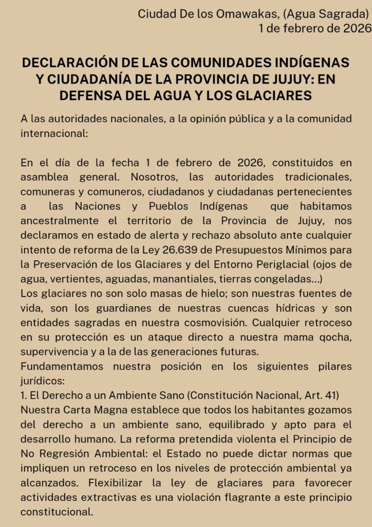 En el día de la fecha, 1 de febrero de 2026, constituidos en asamblea general. Nosotros, las autoridades tradicionales, comuneras y comuneros, ciudadanos y ciudadanas pertenecientes a las Naciones y Pueblos Indígenas que habitamos ancestralmente el territorio de la Provincia de Jujuy, nos declaramos en estado de alerta y rechazo absoluto ante cualquier intento de reforma de la Ley 26.639 de Presupuestos Mínimos para la Preservación de los Glaciares y del Entorno Periglacial (ojos de agua, vertientes, aguadas, manantiales, tierras congeladas…).