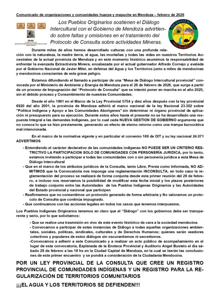 Así lo manifestaron mediante un comunicado, destacando que los pueblos originarios sostienen el Diálogo Intercultural con el Gobierno de Mendoza , el cual se realizará el 28 de febrero, advirtiendo sobre faltas y omisiones en el tratamiento del Protocolo de Consulta sobre actividades Mineras. Las comunidades indígenas realizaron una impugnación del Protocolo de Consulta que el gobierno intentó poner en marcha en 2025.